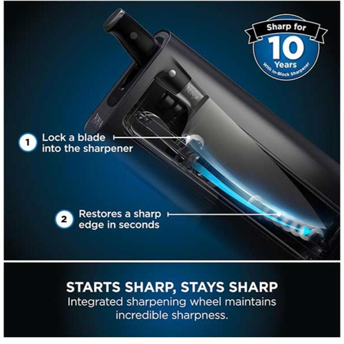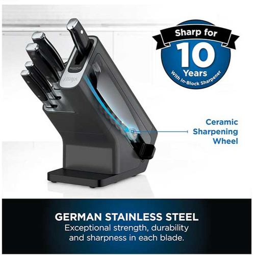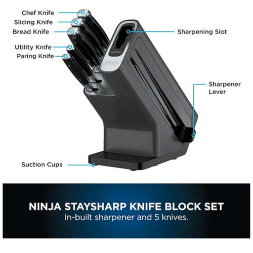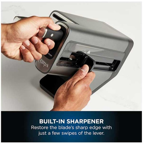امکان تیز کردن چاقوها در شیار تعبیه شده روی بلوک, به توصیه کمپانی نینجا تیز کردن چاقوها را هر 2 هفته یکبار به انجام برسانید, به توصیه کمپانی نینجا چاقوها را در ماشین ظرفشویی قرار ندهید. بعد از استفاده چاقوها را به صورت دستی شستو داده و خشک کنید